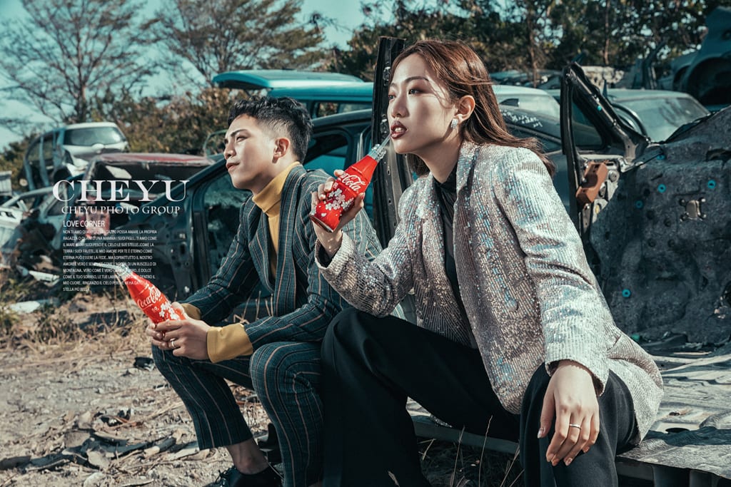新郎與新娘當日在廢車廠這樣的特殊風格下給了一道道有利的眼神